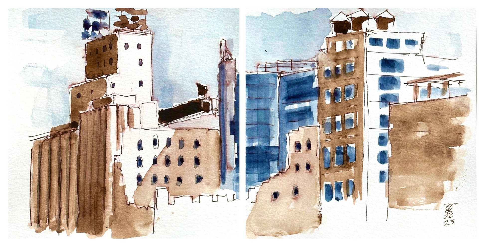 Diptych of two 6x6 watercolor sketches created as one composition.