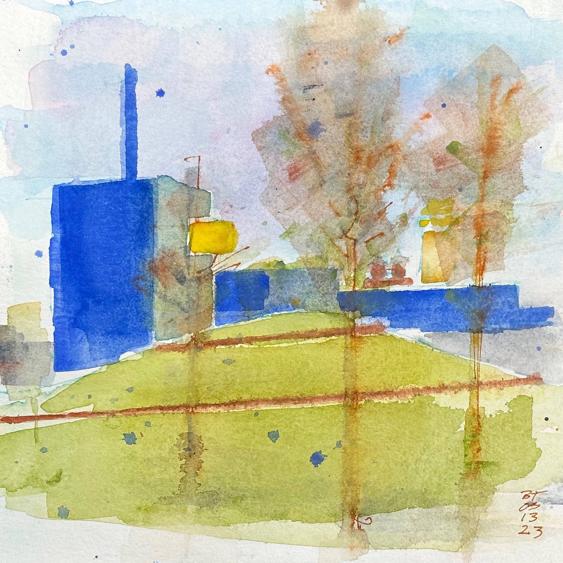 8" x 8". Fits nicely into this frame, with mat, from Amazon.