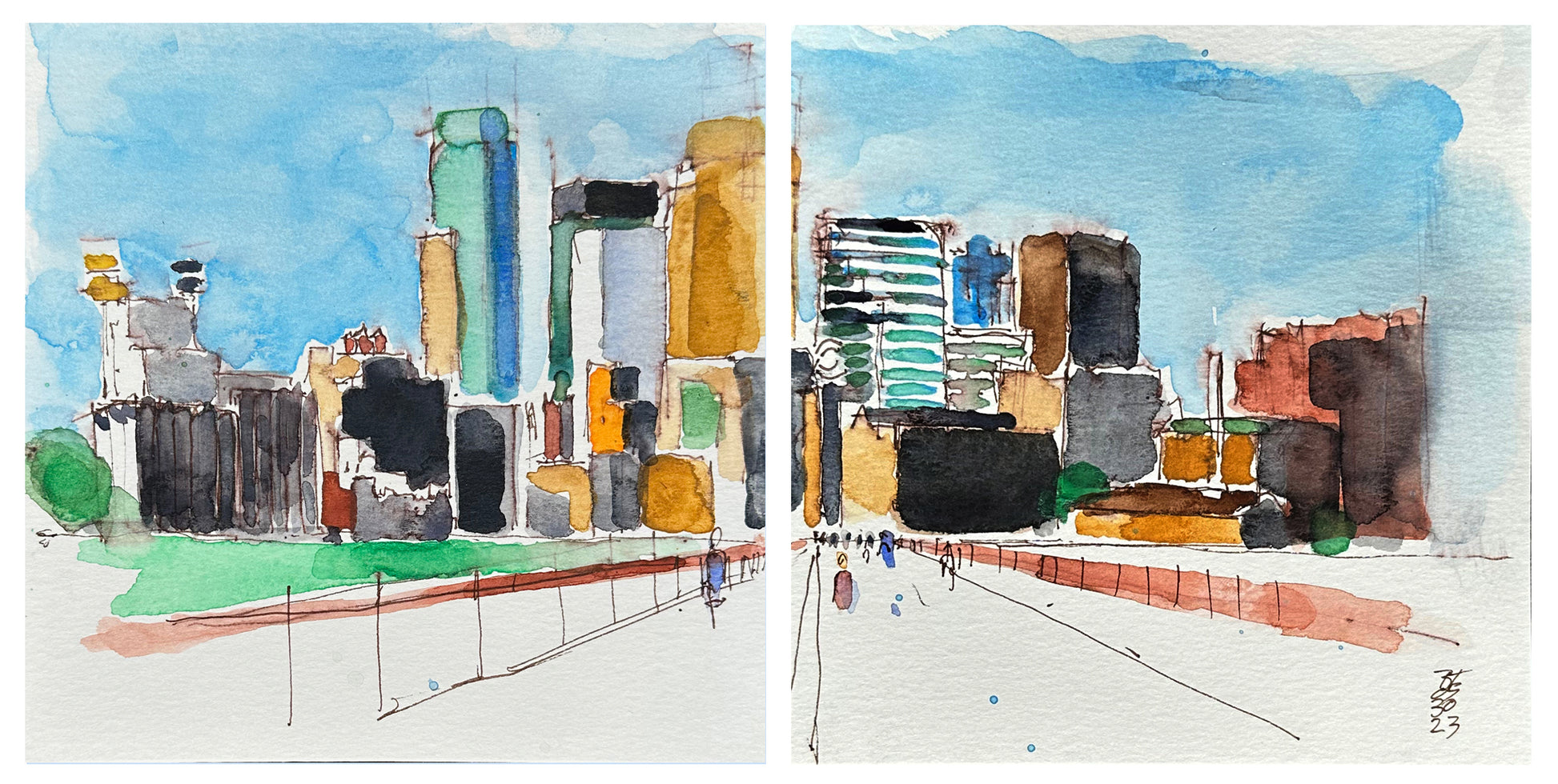 Diptych of two 6x6 watercolor sketches created as one composition.