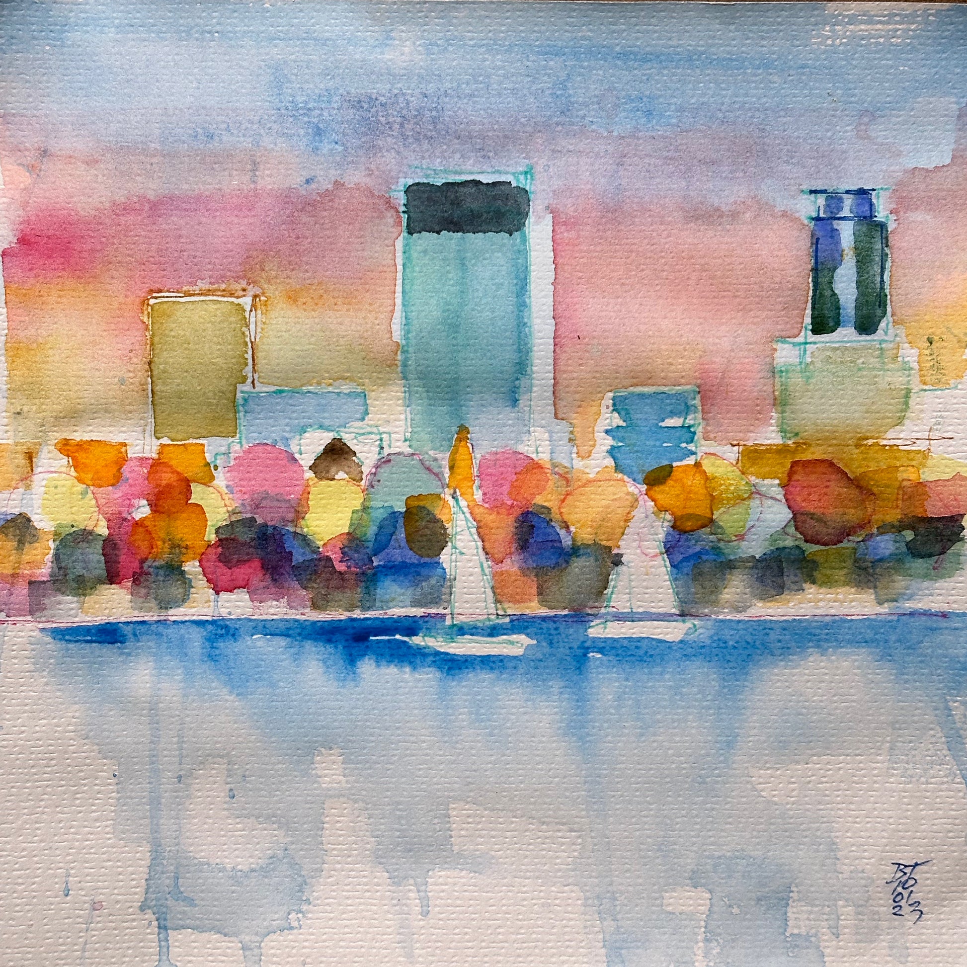 Minneapolis skyline across lake, 2 sailboats, 10.01.23