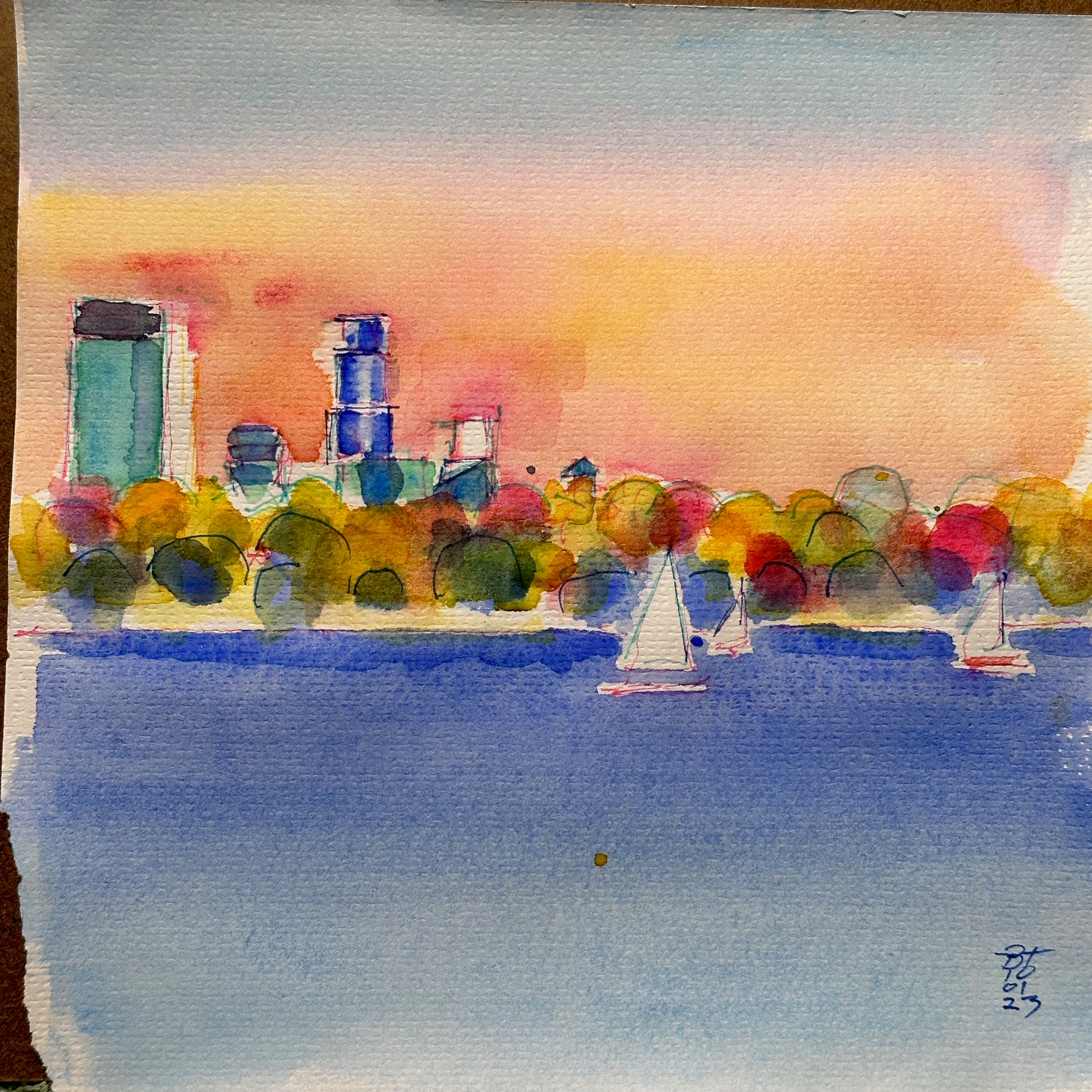 Minneapolis skyline across lake, 3 sailboats, 10.01.23