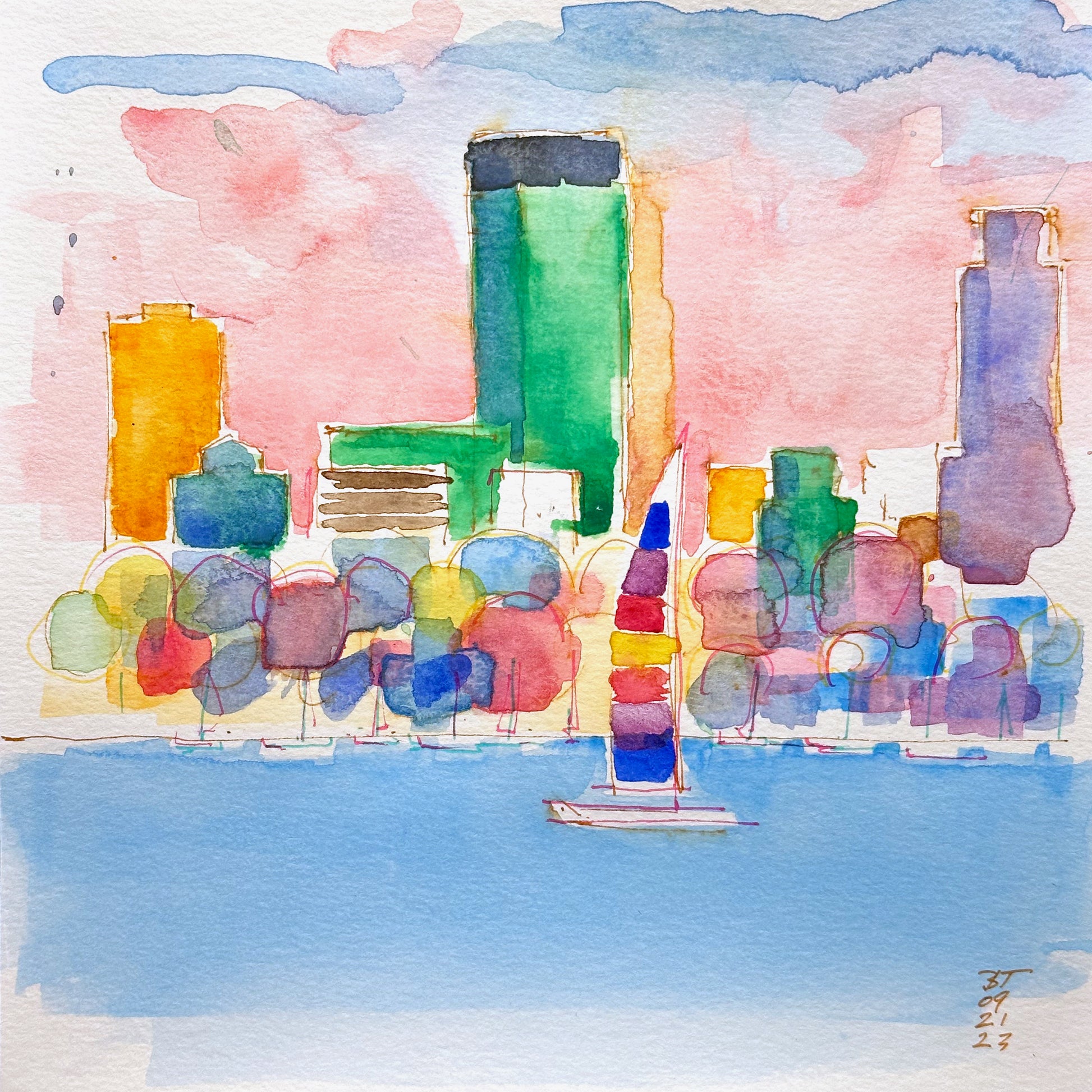 Mpls Skyline over Lake Calhoun with Colorful Sail Boat (8x8), 09.21.23