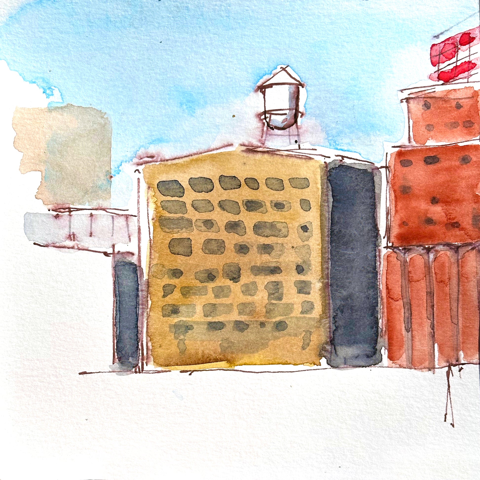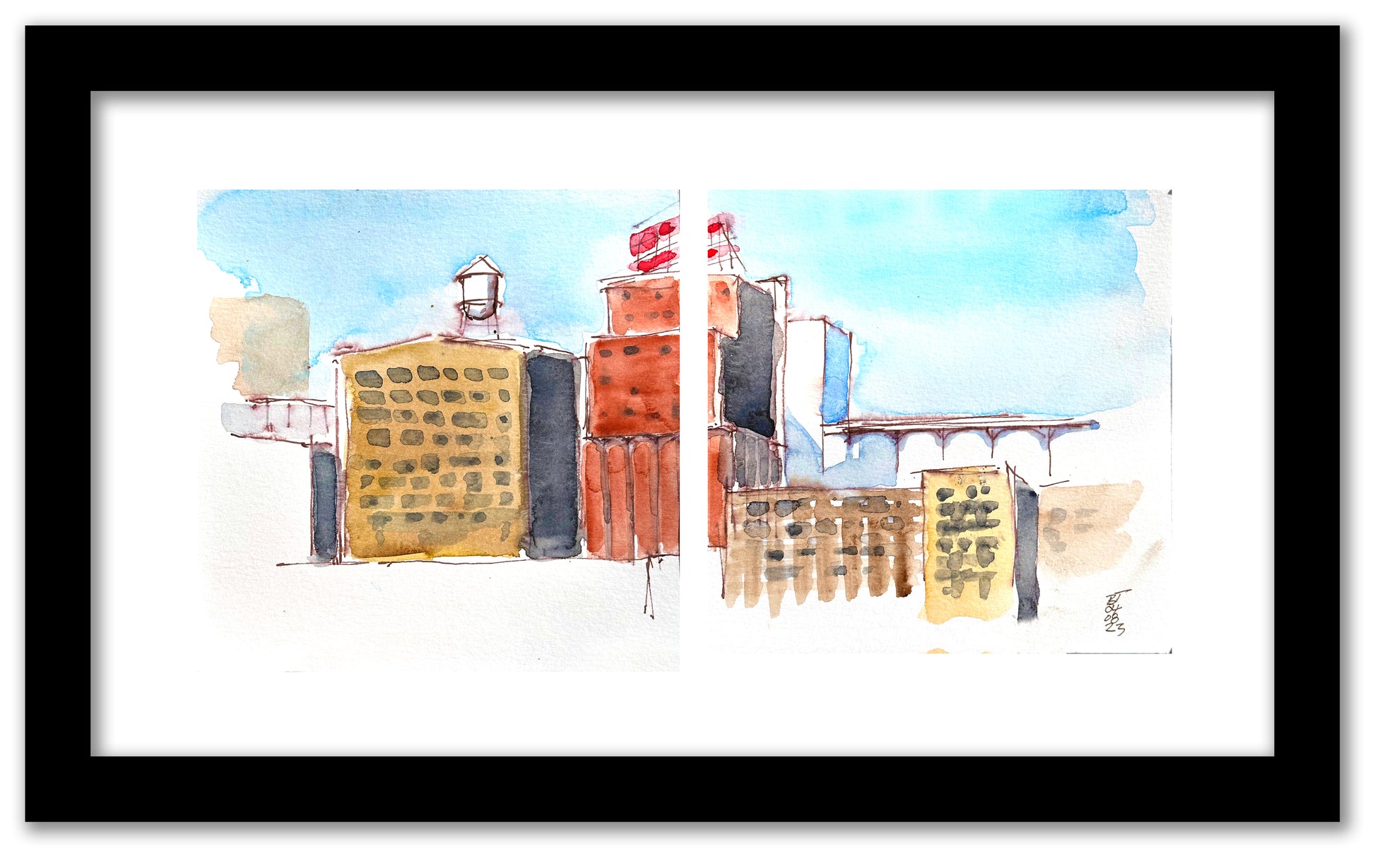 Diptych of two 8x8 watercolor sketches created as one composition, arranged on a 14" x 24" Sheet of paper leaving about a 3 inch paper margin around perimeter, mounted in a 1.25" black wood frame. Ready to hang.