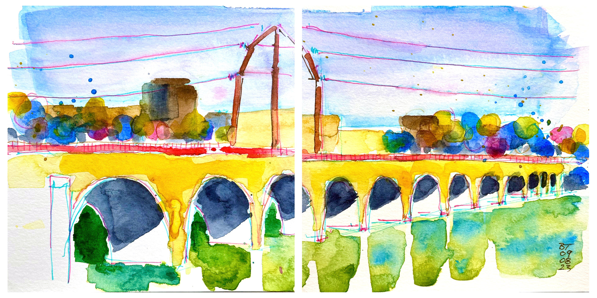 Diptych of two 6x6 watercolor sketches created as one composition.